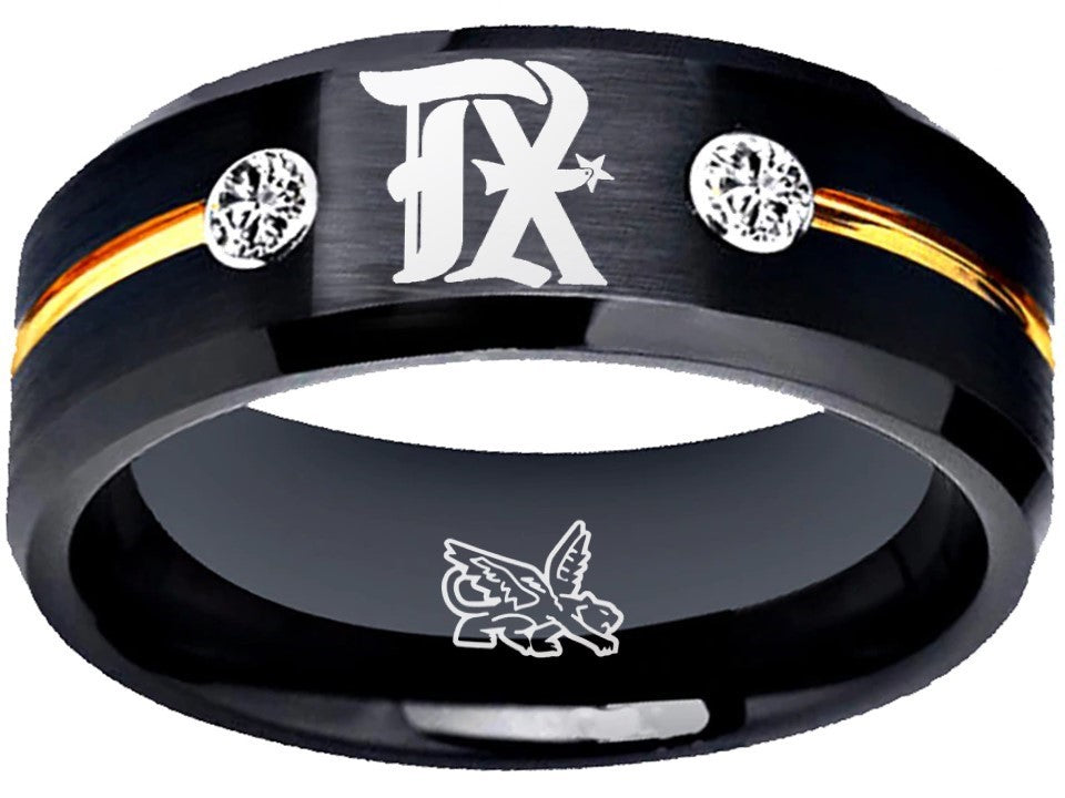 Capture the true essence of Texas Rangers fandom with our exquisite black and gold CZ Texas Rangers City Connect ring. Crafted with precision and passion, this stylish ring features the iconic team logo in striking silver against a sleek black backdrop. Made of durable tungsten, it symbolizes strength and everlasting commitment—a perfect representation of your love and loyalty. Personalize this ring with custom engravings, adding a touch of sentiment to commemorate your special day. Available in sizes 6-13, this exclusive wedding band is the ultimate choice for devoted Rangers fans looking to celebrate their love and team spirit in a truly unique way.