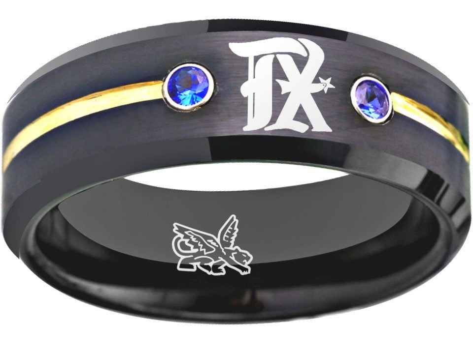 Capture the true essence of Texas Rangers fandom with our exquisite black, gold, and blue CZ Texas Rangers City Connect ring. Crafted with precision and passion, this stylish ring features the iconic team logo in striking silver against a sleek black backdrop. Made of durable tungsten, it symbolizes strength and everlasting commitment—a perfect representation of your love and loyalty. Personalize this ring with custom engravings, adding a touch of sentiment to commemorate your special day. Available in sizes 6-13, this exclusive wedding band is the ultimate choice for devoted Rangers fans looking to celebrate their love and team spirit in a truly unique way.